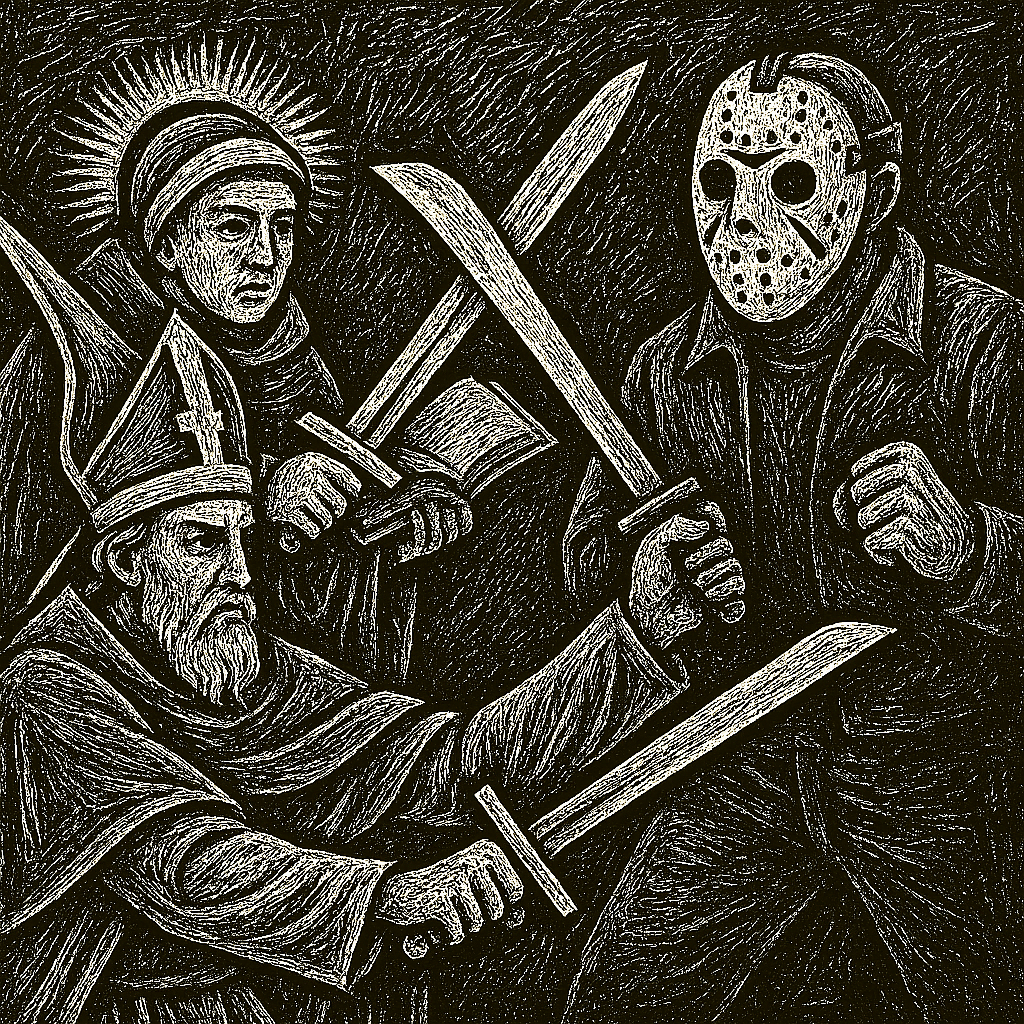 En La ciudad de Dios, san Agustín (354-430) sostenía que cuando los seres humanos no se ordenan hacia un bien superior, la ciudad se convierte en un “latrocinio” organizado: una banda de ladrones con leyes propias. El asesino del slasher encarna esa inversión: no hay comunidad ni propósito trascendente, sólo la fuerza bruta que reclama un espacio. La máscara del asesino es, en cierto modo, el recordatorio de lo que sucede cuando la sociedad pierde su vínculo con la justicia y el bien común, lo humano retrocede.