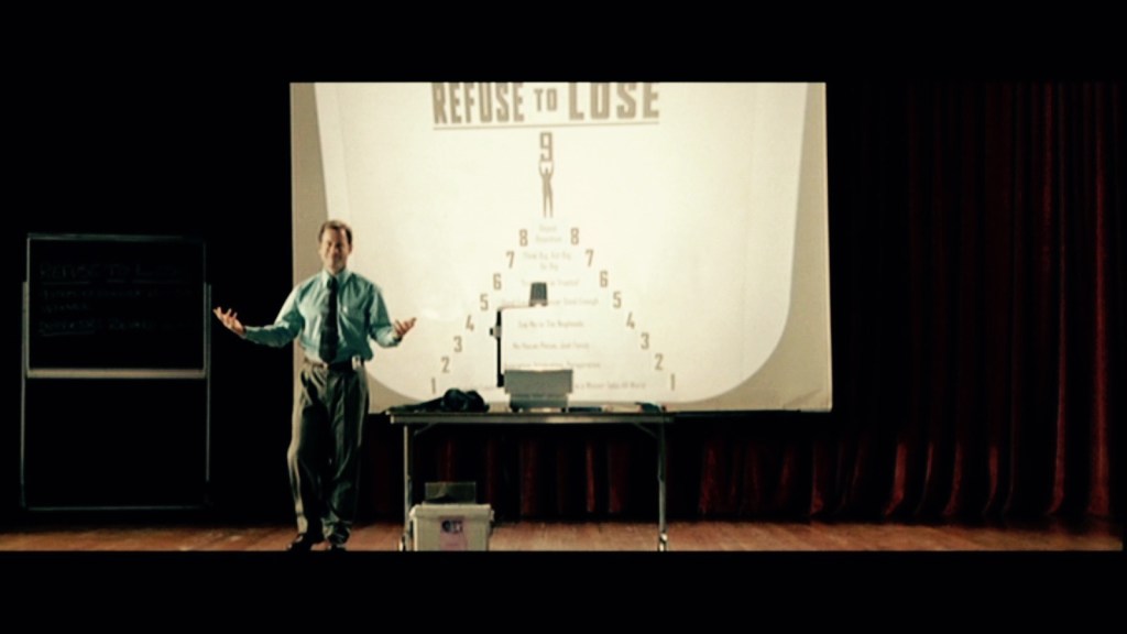 El padre de familia, Richard, vive obsesionado con su método de “9 pasos hacia el éxito”. Su filosofía es simple: divide el mundo entre ganadores y perdedores. Lo fascinante es cómo la película desmonta esta idea no mediante discursos, sino mostrándonos cómo el propio Richard es el mayor perdedor de todos. Su método nunca funciona, su negocio fracasa y su familia está al borde del colapso. La mentalidad “exitosa” se derrumba y se vuelve contra uno. Es la crítica social y cultural del éxito, en donde las palabras y discursos motivacionales no funcionan.