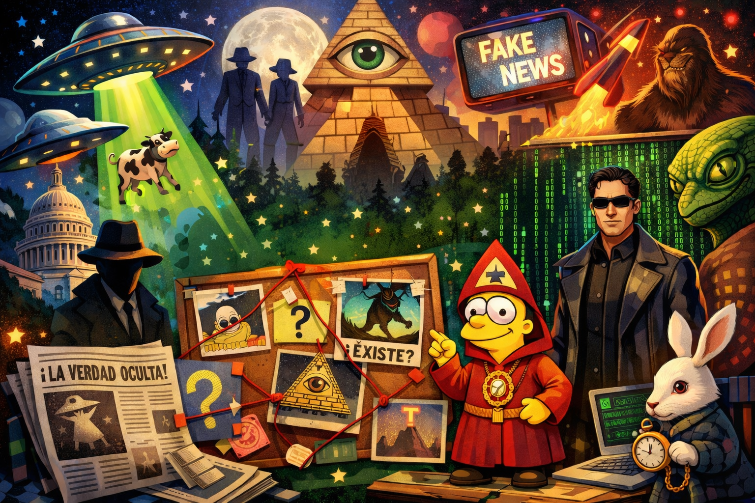 Pensemos en los clásicos de la cultura. Ya ni necesitamos textos falsos del siglo pasado; nuestro imaginario colectivo lo pinta mejor. Los Simpson, en el capítulo “Homero el Grande”, dieron en el clavo décadas antes de que fuera cool. Homero se une a los “Stonecutters/Magios” (una clara parodia de los masones), una sociedad secreta que, según la canción, «controla la banca británica y mantiene a los marcianos bajo vigilancia». El chiste es brillante porque no es simplón. Es un espejo. Nos reímos porque reconocemos esa tentación infantil de creer que alguien, en alguna parte, tiene un panel de control con todas las palancas del mundo. Es la teoría de la conspiración en su versión cómica y autoindulgente. El caos no existe, pero sí un club de hombres con extraños y ridículos rituales que toman todas las decisiones mundiales. Es más reconfortante que admitir que nadie lleva el volante.