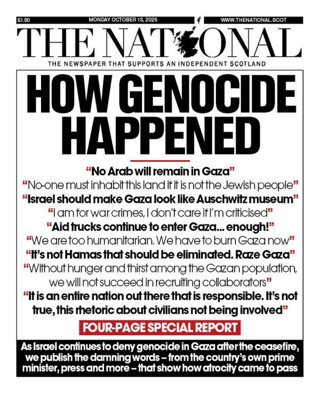 The National CÓMO OCURRIÓ EL GENOCIDIO “Ningún árabe permanecerá en Gaza” “Nadie debe habitar esta tierra si no es el pueblo judío” “Israel debería hacer que Gaza parezca un museo de Auschwitz” “Estoy a favor de los crímenes de guerra, no me importa si me critican” “Los camiones de ayuda continúan entrando en Gaza… ¡suficiente!”Sigue leyendo «Portada de The National (Diario escocés) del lunes 13 de octubre de 2025»